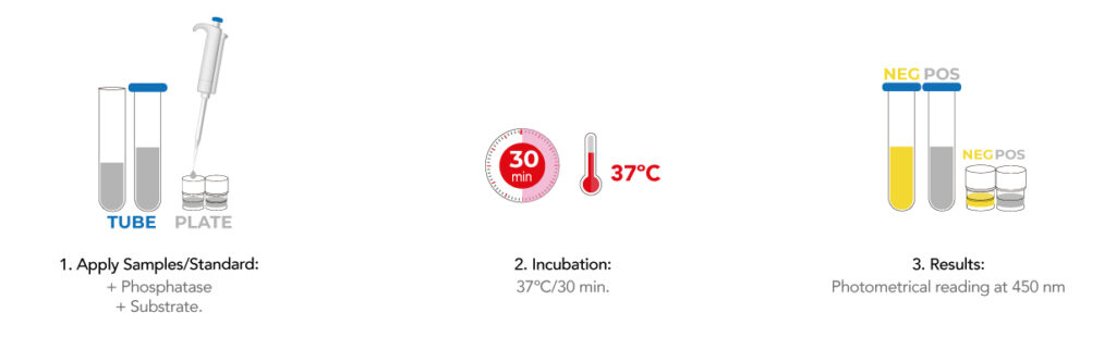 This methodology reproduces the mechanism of action of microcystins in humans and is based on the ability of phosphatase to hydrolyse a substrate, forming a product detectable at 405 nm. The enzymatic activity of phosphatase is inhibited by microcystins proportionally to their amount in the sample.