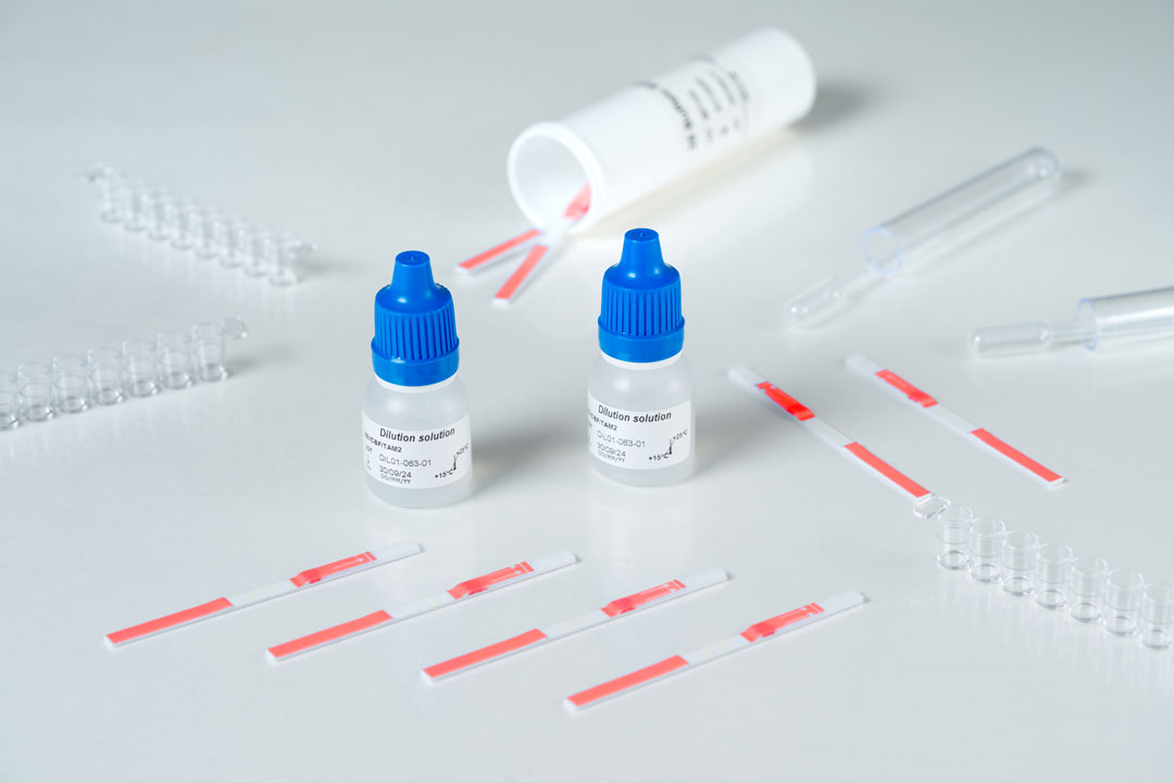 Solo hay que mezclar una gota de leche con unas gotas de la solución de análisis e introducir la tira reactiva.